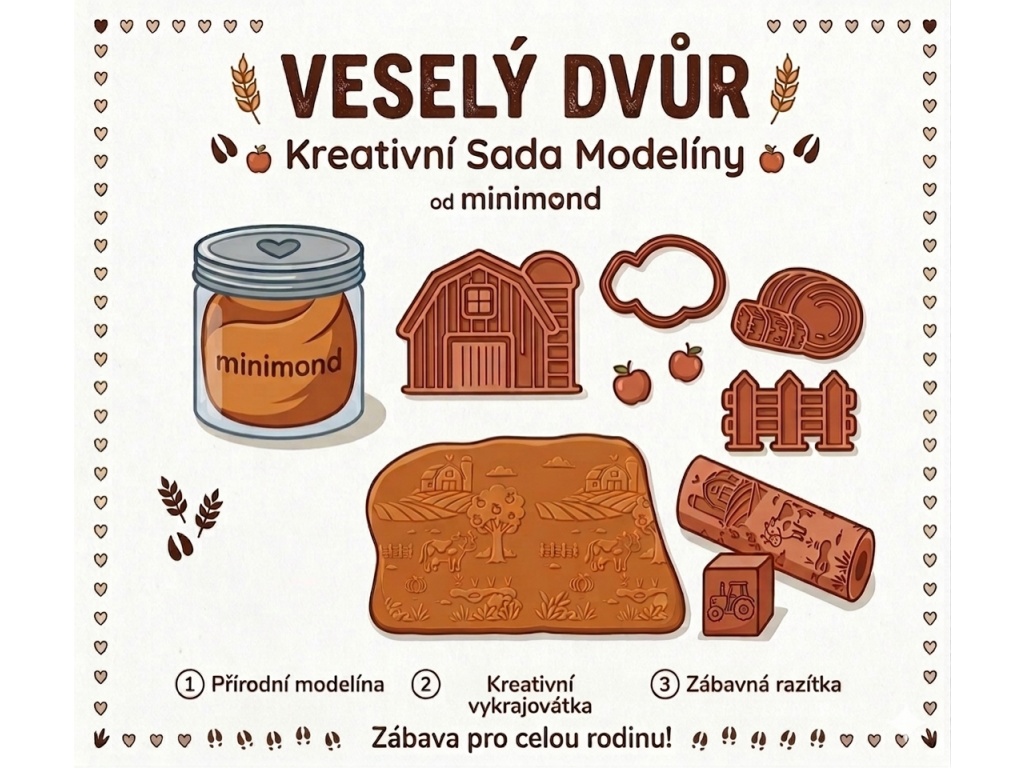 - 3D doplňky Minimond: Vykrajovátka a razítka s motivem zvířátek, stromečků nebo plotu, navržená speciálně pro snadný úchop dětí.